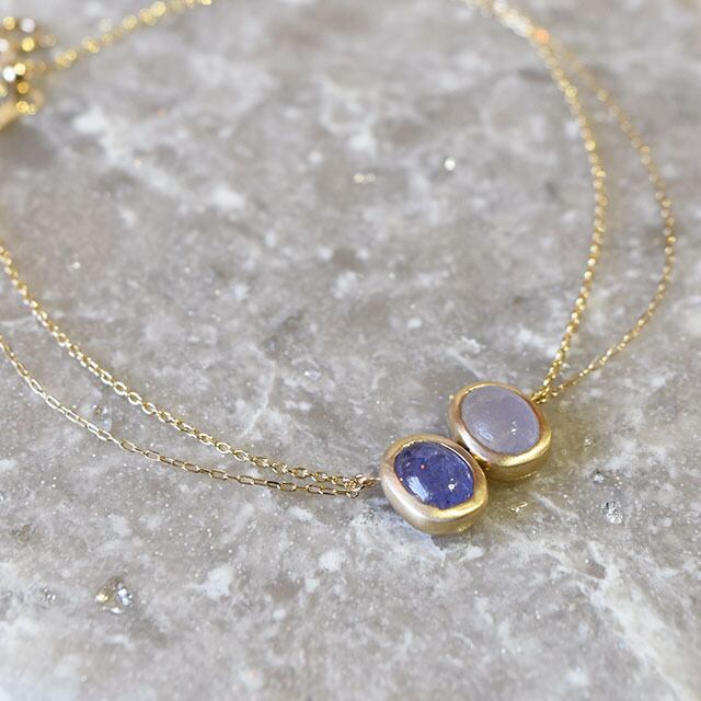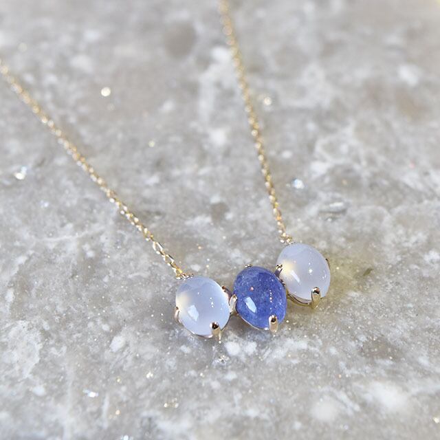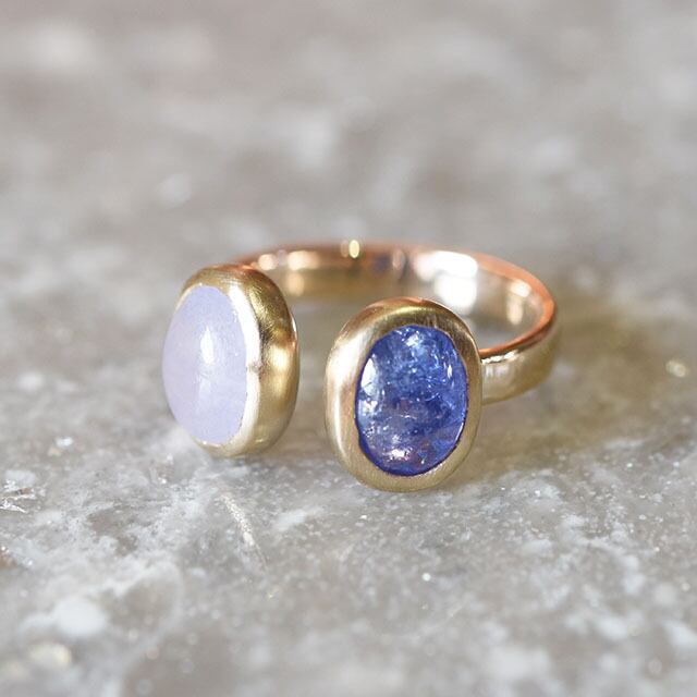 センターのタンザナイトと両サイドのラベンダー翡翠が